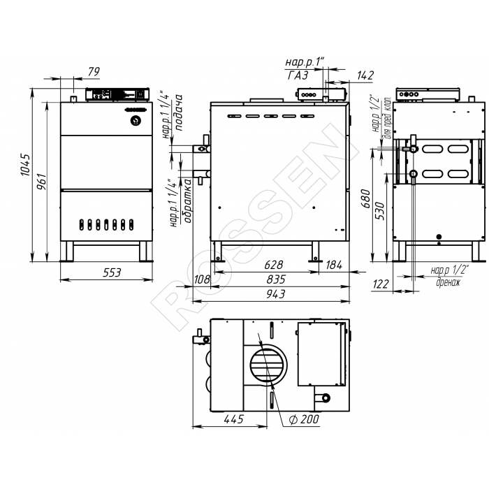 Котел RSA 80 имеет открытую топку и оборудован атмосферной горелкой. Теплообменник производится на Заводе Rossen, выполнен из оребренных труб с увеличенной поверхностью теплоотдачи.