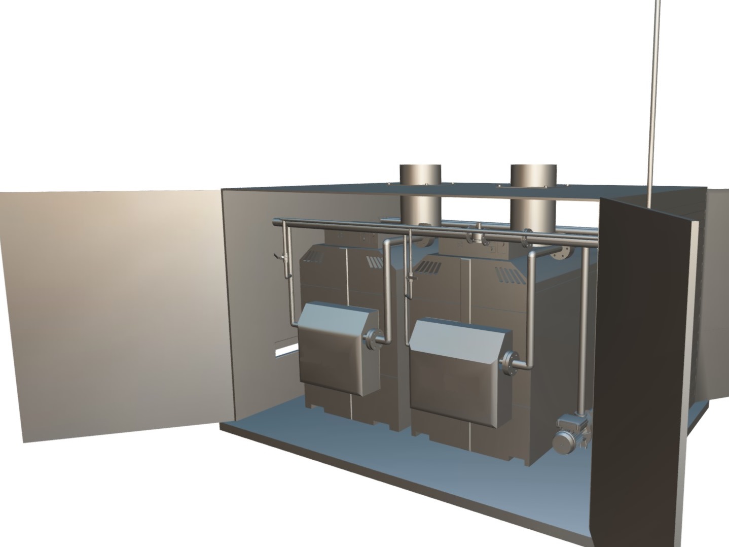 - Стенки наружного контейнера котла выполняются из сэндвич-панелей толщиной от 50 до 100 мм., в зависимости от климатической зоны. Для обслуживания котла передняя и задняя панели выполнены открывающимися, с двухстворными дверями.