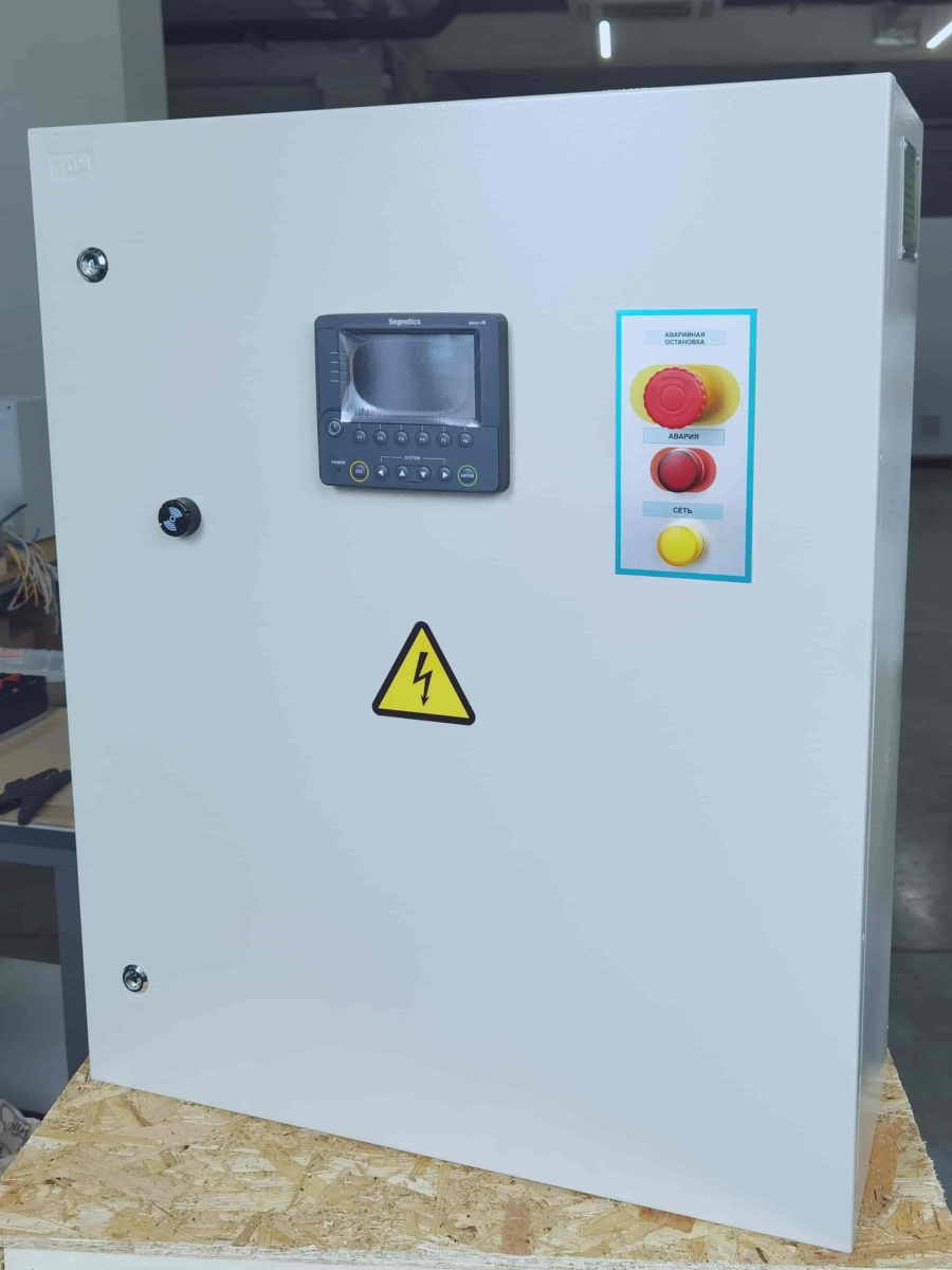 Система автоматики работает на контроллере Segnetics SMH4. Контроллер принимает сигналы с датчиков и выдает управляющие сигналы, соответствующие режиму и алгоритмам работы, на исполнительные устройства и реле для управления технологическим оборудованием. Шкаф имеет степень защиты IP65.
