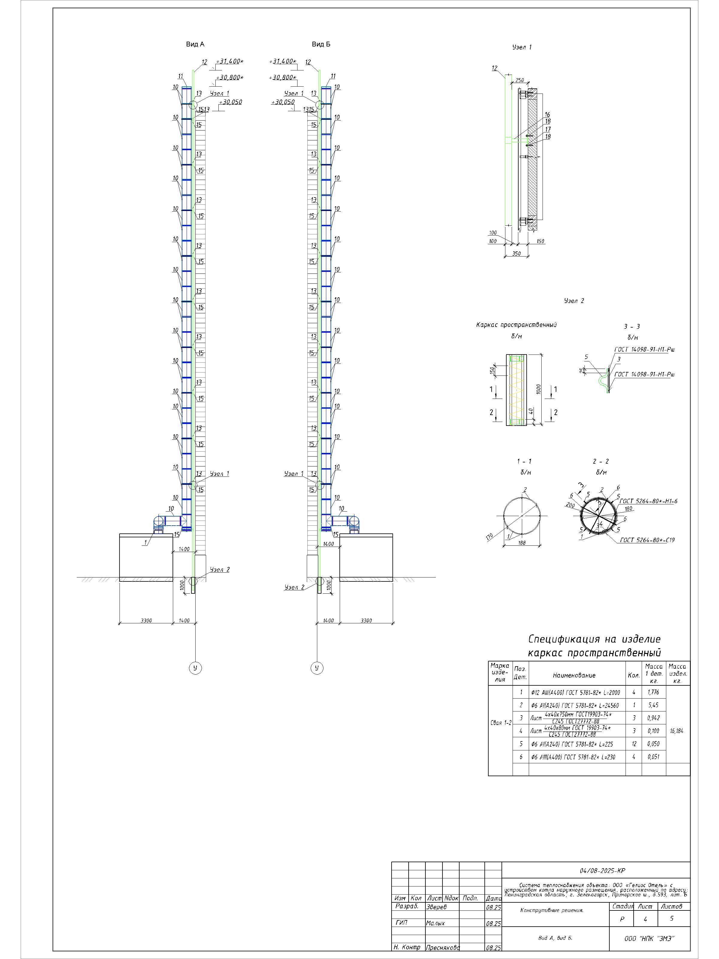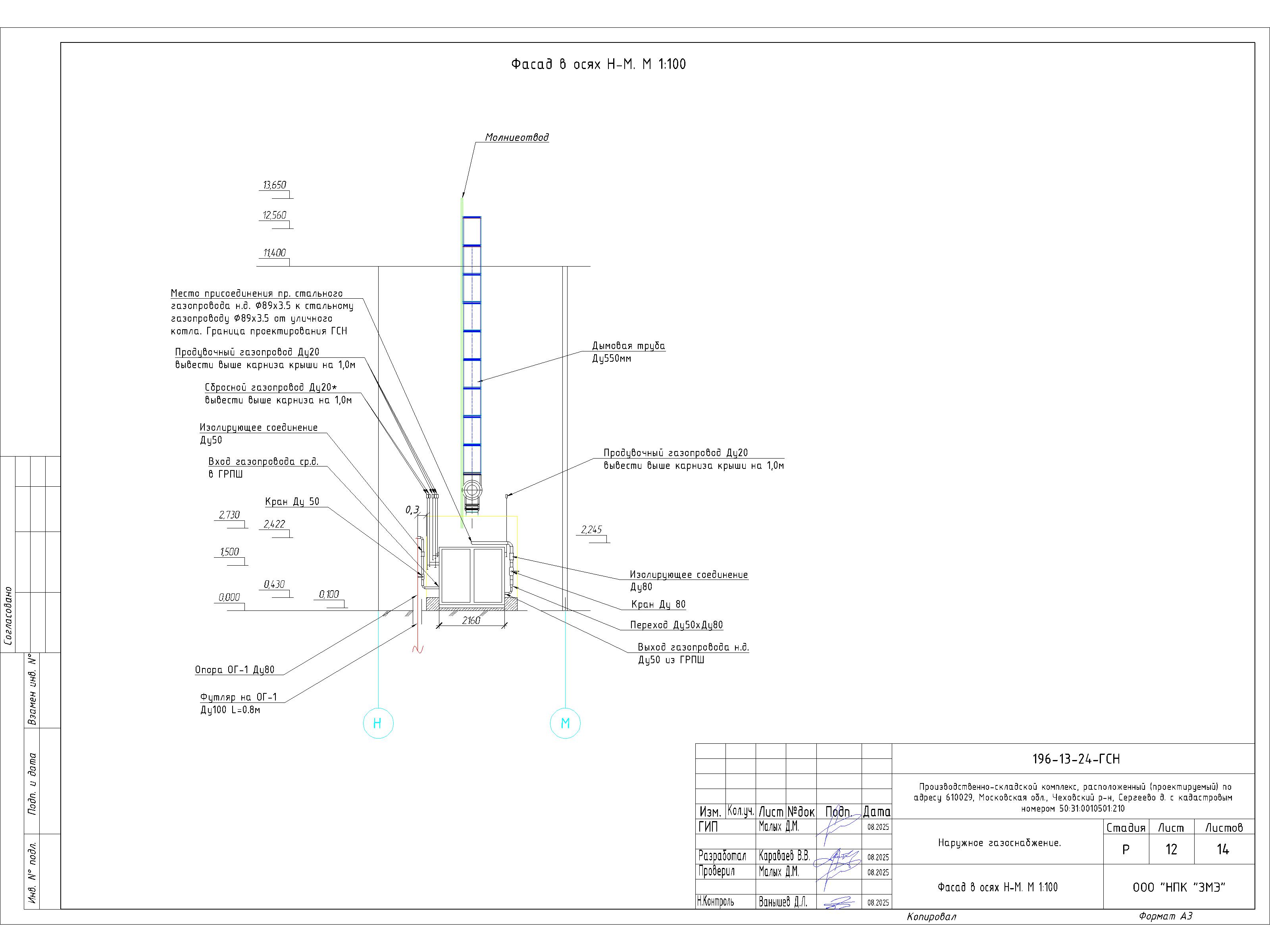 Наше любимое техническое решение, так сказать, классика проектирования КНР – это использование молниеотвода, защищающего котел наружного размещения и ГРПШ (при наличии), как несущей конструкции дымохода. Это техническое решение разработано нашими инженерами – оно самое дешевое и надежное, и показало себя прекрасно за десяток лет.
