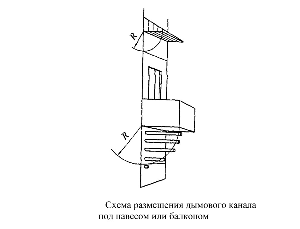 Не допускается размещение коаксиальных дымоходов на фасаде зданий под вентиляционной решеткой. Наименьшее расстояние между двумя отверстиями каналов на фасаде здания следует принимать не менее 1,0 м по горизонтали и 2,0 м по вертикали. При размещении дымового канала под навесом, балконами и карнизами кровли зданий канал должен выходить за окружность, описанную радиусом R на рисунке.